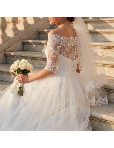 High-quality off-white sheer lace topper with a rose design. Cropped to finish just below the bust at the natural waist, with a bateau neckline and bare shoulders—perfect for strapless and low-cut dresses. Made in Spain, made to order .Delivery in 15-25 days aprox.