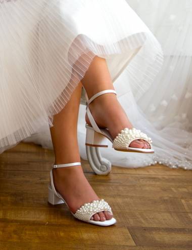Bridal sandals with wide and low heels.A wedding shoe full of glamour covered with pearls in the front strip, but without giving up comfort thanks to the bass heels of only 4.5cm.Bracelet to tie the ankle that stylizes the foot.Premium quality.Interior padded and finished in leather.