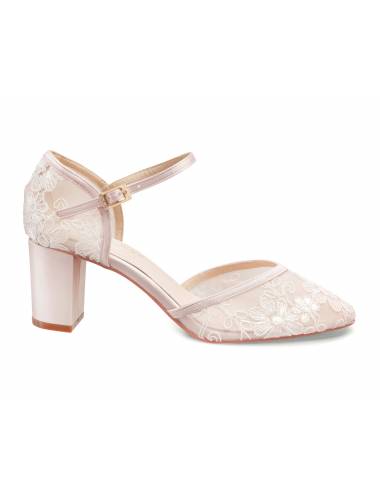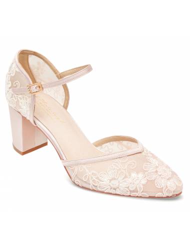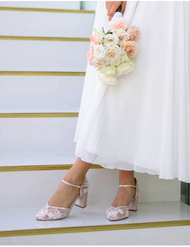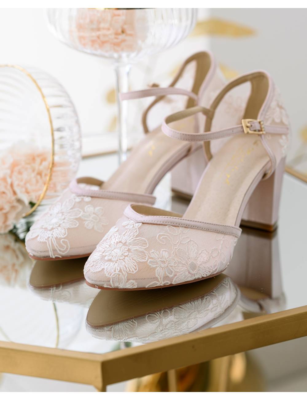 Bride shoes with fine toe and wide square heels.The special detail puts the lace appliance on the sides.A very feminine and glamorous wedding shoe that will be perfect with your dream girlfriend dress.Skin padding.