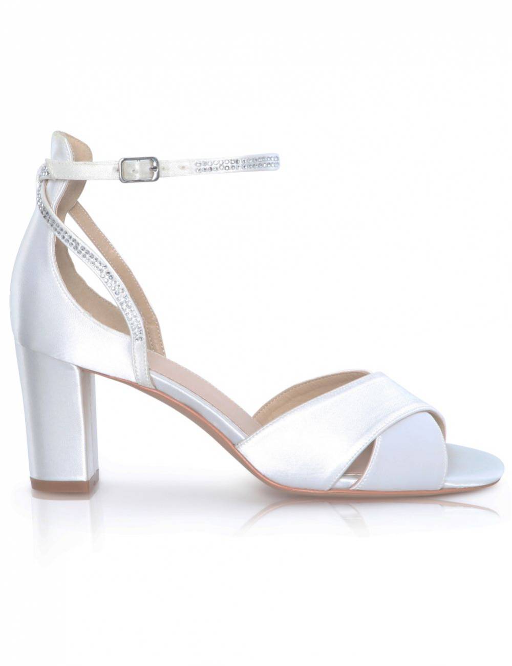 Novia sandals with a very elegant design.7cm wide square heels which ensures glamour and comfort.Indoor in natural skin padding, so you can stand without problem all day.Broken white color