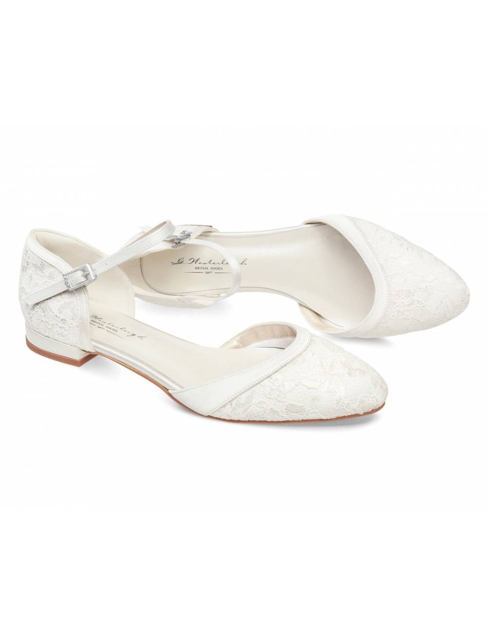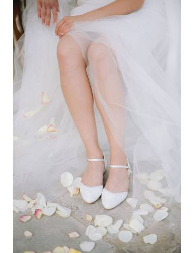 Flat bridal shoes lined with lace.A romantic and elegant creation.Comfort for your big day, with padded skin template.Total height of heel 1.7cm.
