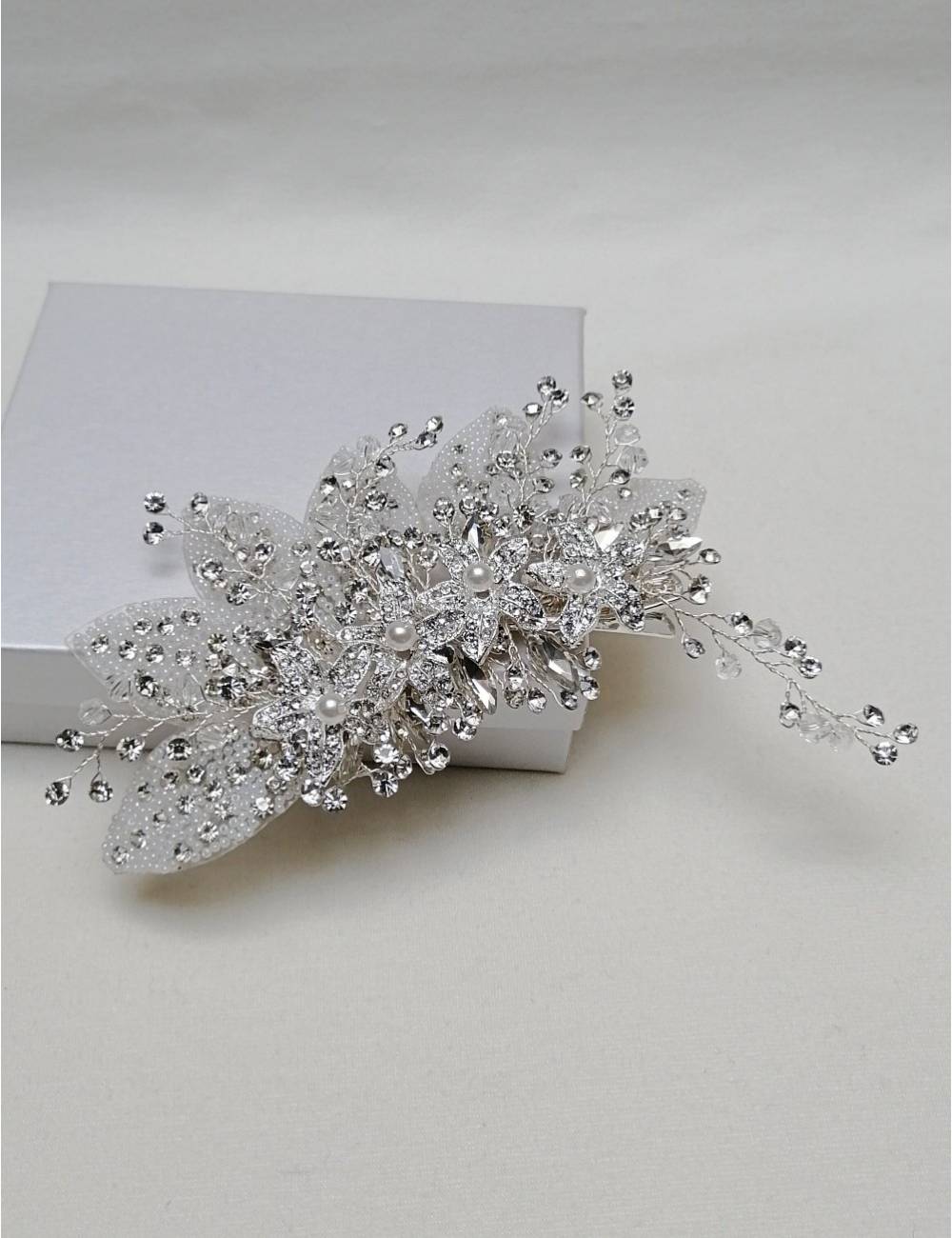 Hand-mounted wedding comb, with silicone flowers covered with pebbles embedded in natural white tones.Made with pebble and metallic elements in silver colour.A colorful and original touch that will look a lot on your wedding hair