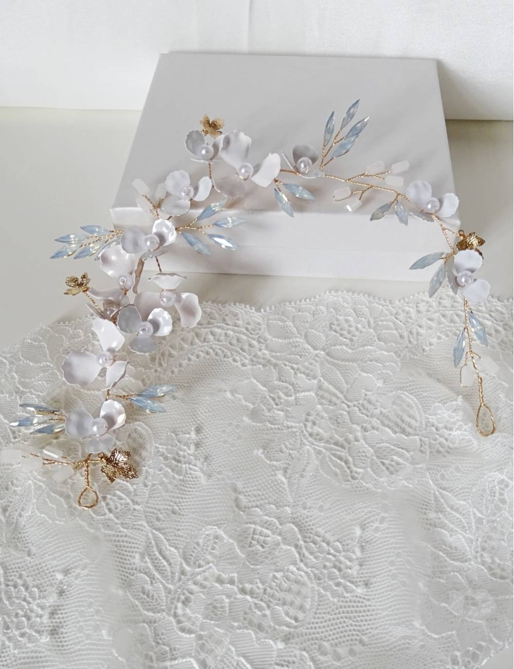 Bridal headdress in the form of flexible ribbon to adapt it to your hairstyle. handmade piece by piece in a handmade way.Delicate and elegant with a very aromatic style.