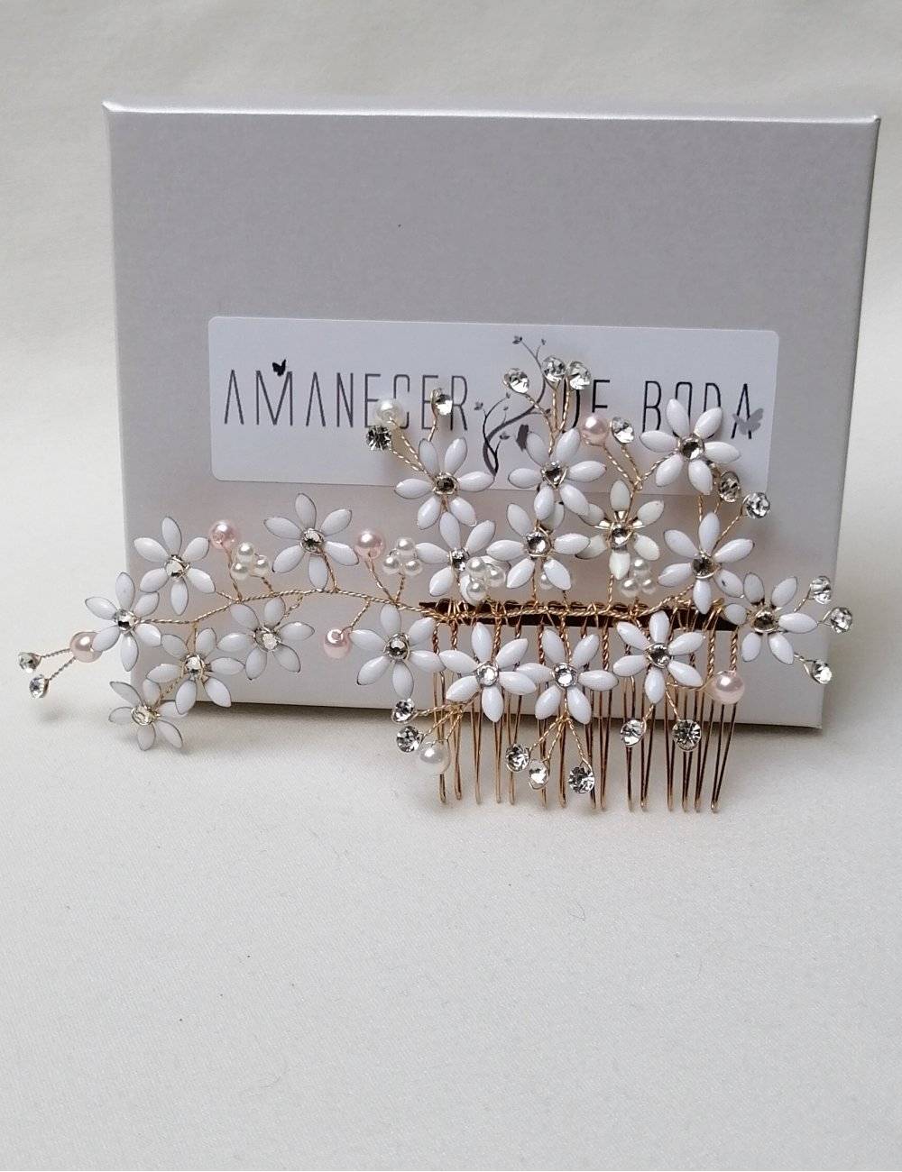 Handmade wedding headdress with small flowers enameled in a broken white color, and high quality crystals.Mounted on a metal comb so you can place it very easily.Measurements: 14cm *8cm.Very light.You won't even notice you're wearing it.