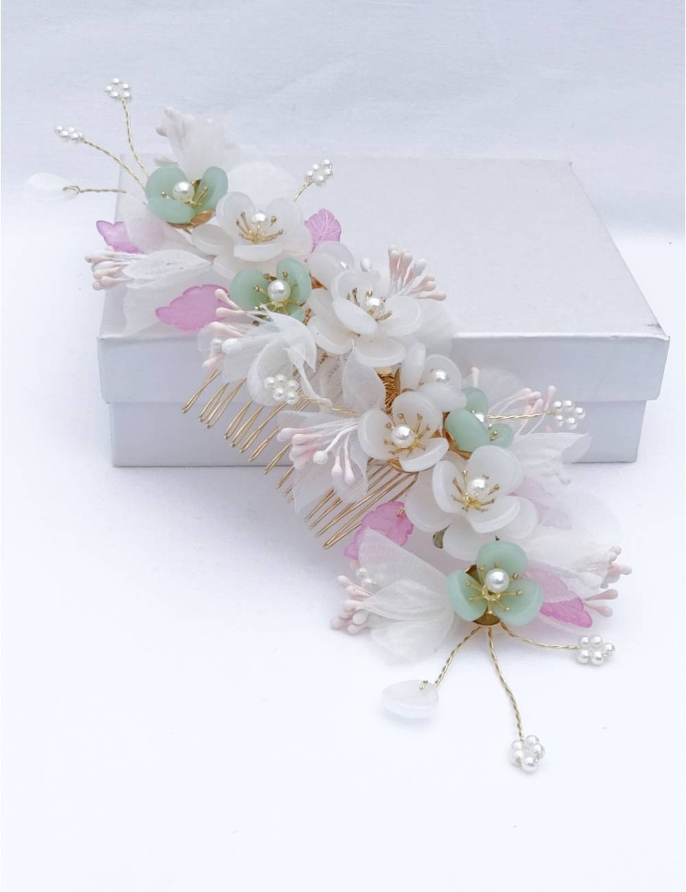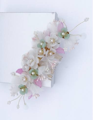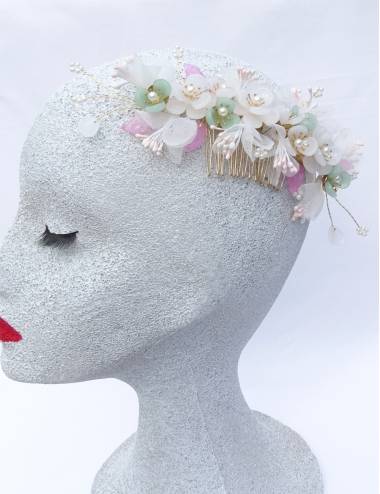 Noviabonite comb and original, madeamano with broken white gauze flowers, resin flowers in white and light green shades, and pink leaflets.A complement that was perfect with your wedding look.Take a comb to facilitate your placement,