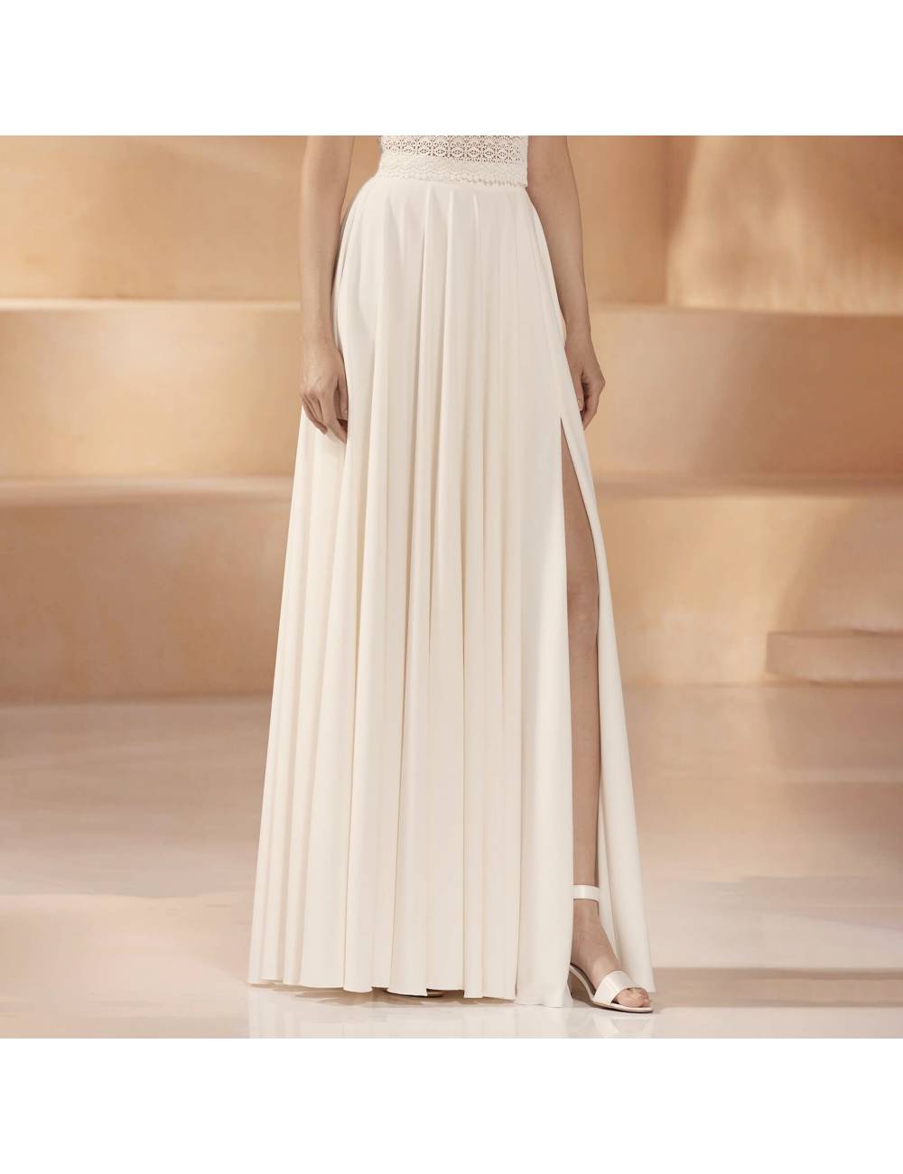 Falda larga de crepé de calidad premium, forrada, para novias. Esta falda de novia de crepe en color off white, tiene una abertura en la pierna, siguiendo las tendencias mas actuales, y es ideal para crear tu conjunto de novia perfecto, haciendo un mix and match perfecto con nuestros boleros y abrigos. Podrás elegir entre múltiples opciones para tener el vestido de novia perfecto compuesto por varias piezas que se pueden mezclar en perfecta armonía de color, y materiales.