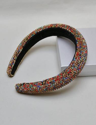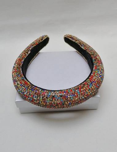 Diadema de pedrería hecha artesanalmente con centenares de pequeños apliques de cristal de diversos colores.