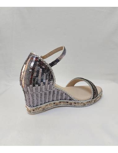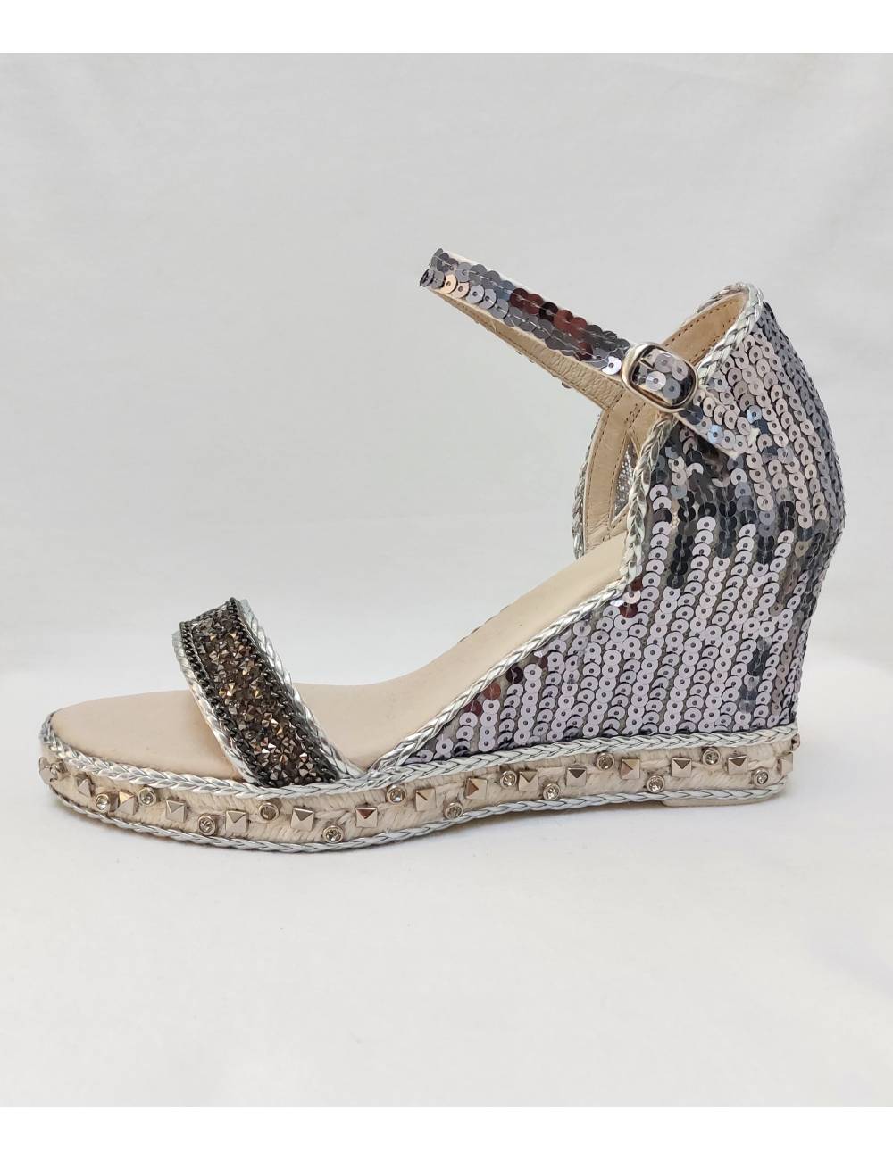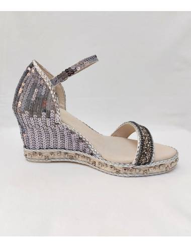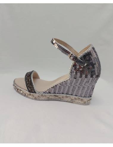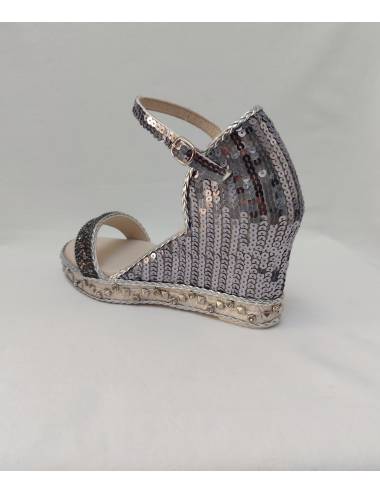 Espectaculares alpargatas de fiesta para invitadas en color plata y acero. Para brillar con estas cuñas de jute decoradas a mano artesanalmente, para crear unas alpargatas de fiesta únicas, súper elegantes y realmente especiales. La parte del talón esta forrada con bonito tejido de lentejuelas, con la banda inferior donde se han aplicado apliques de tachuelas y cristales a juego, y banda delantera con decenas de pequeños cristales que crean un efecto de acero. Rematando el conjunto una bonita tira trenzada en color plata. disponibles con cuñas de 8,5cm y de 5cm