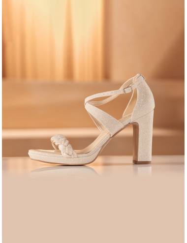 Sandalias de fiesta de ensueño con efecto glitter dorado muy elegantes para invitadas de boda que deseen conseguir un look de gran impacto. Tacones de 10,5cm, compensados con plataforma delantera de 2cm. La sujeción está garantizada con las dos tiras anchas que además aportan un plus de elegancia. Pero el detalle que las convierte realmente en unas sandalias de fiesta unicas, es la preciosa tira delantera con forma trenzada, llena de originialidad y glamour. Estas maravillosas sandalias son muy versátiles y pueden acomodarse muy bien tanto para un look de invitada como para novias que deseen un toque diferente en su outfit nupcial.
