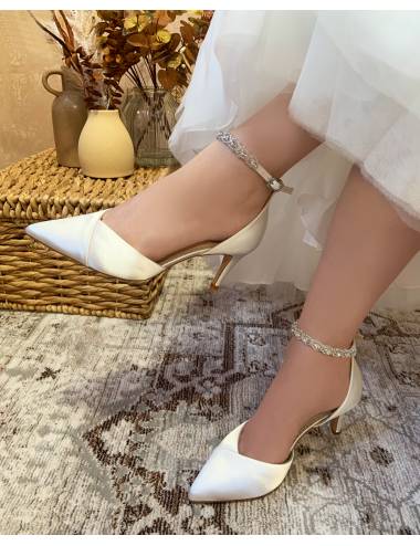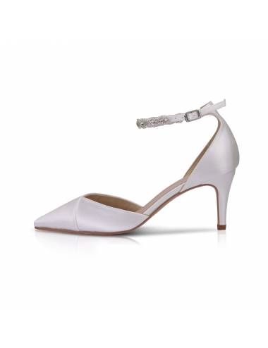Estos maravillosos zapatos de novia no pueden ser mas perfectos! Extremadamente elegantes, con un diseño realmente perfecto. La puntera ligeramente afilada se combina con una fina pulsera que se ata al tobillo decorada con una tira de pedrería de cristales de gran calidad y brillo. Tacón bajito y fino qe le dan un plus, combinando glamour y comodidad. Para novias que tienen casi la misma altura que el novio, y no quieren usar unos stilettos.