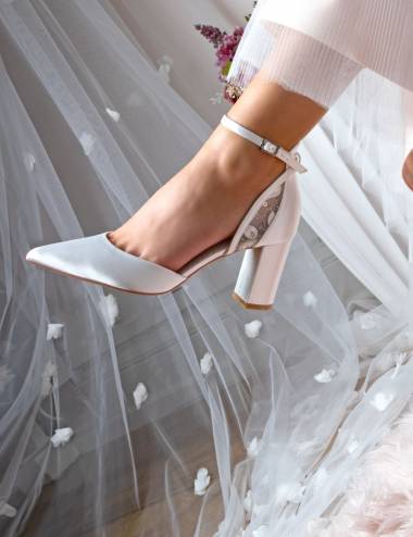 Zapatos planos novia forrados de satén off white y precioso detalle de encaje en la zona del tobillo. Puntera cerrada y tacones anchos de plena tendencia. Un autentico best-seller. Aprovecha ahora la oferta limitada a precios especiales Tacones con 7,3cm