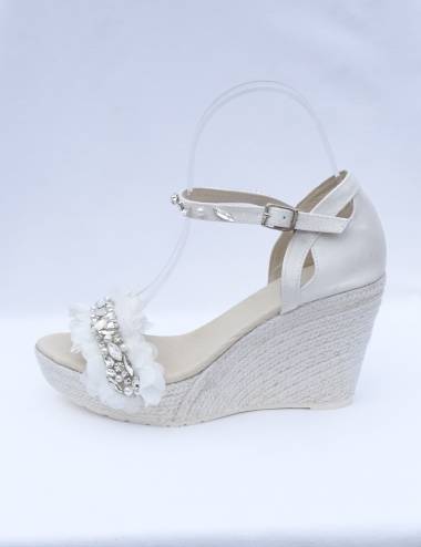 Preciosas y favorecedoras alpargatas de novia con tira de pedrería de altisima calidad, montada sobre pequeños volantitos de organza. Fabricación artesanal en España, con materiales de primera calidad para tu total confort. La plantilla y el interior es de piel, el exterior de raso blanco roto. Suela de goma antideslizante. Cuña de 9,5cmy plataforma delantera de 2,5cm