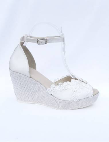 Alpargatas de novia muy favorecedoras y espectaculares. Una creación exclusiva de nuestra tienda para todas las novias. Si buscas comodidad, elegancia y un look muy original este par de alpargatas nupciales son ideales para ti. Cuña ligera y muy cómoda, con 9,5cm de altura y 3cm de plataforma