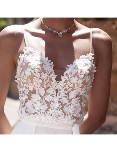 ** Disponible mayo de 2025. Top de novia confeccionado en precioso encaje floral de calidad premium, con apliques de cuentas. Con un diseño muy femenino y favorecedor, con tirantes y escote en V en la parte frontal. Este bonito y elegante top para boda se ha confeccionado usando una capa de encaje suave debajo, y una segunda capa de encaje floral encima creando un efecto romántico muy original. Puedes usar este precioso bolero nupcial como parte de arriba, para crear un conjunto de novia perfecto, añadiendo una falda de tul o un pantalón vaporoso. Se cierra en la espalda con cremallera.