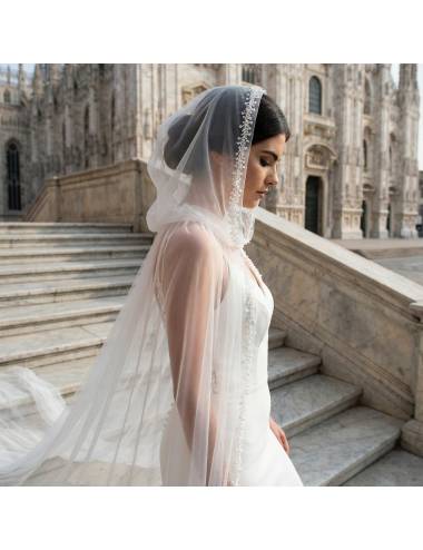 Questa mantella per sposa con cappuccio è realizzata in tulle morbido e impreziosita da un bordo delicato con perline Miyuki semi-trasparenti, mini perle e paillettes per una luce discreta e raffinata.