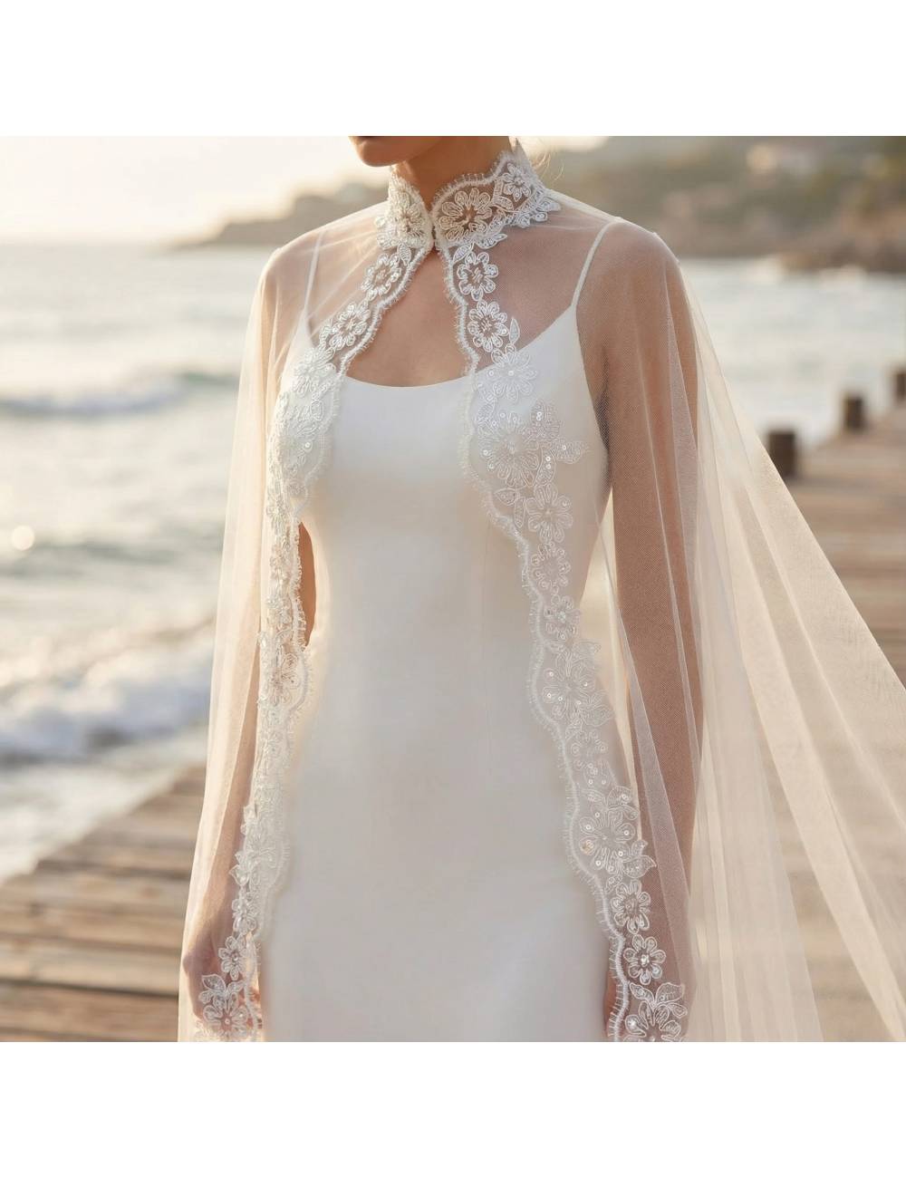 Perfetta per chi desidera lo stile abiti da sposa con mantella, con un dettaglio in pizzo che valorizza il décolleté senza appesantire.