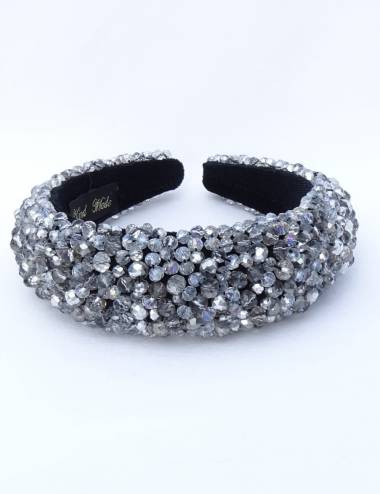 Diadema de fiesta en pedrería color gris oscuro. Espectacular tocado de fiesta montado a mano con centenares de abalorios en diferentes tamaño.