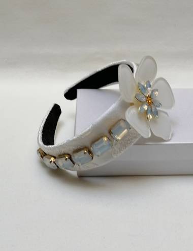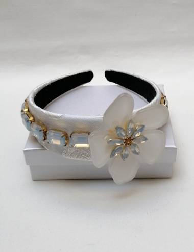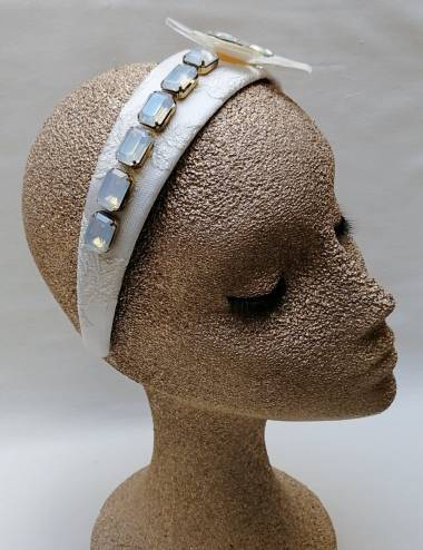 Diadema para fiesta, ideal para novias o invitadas. Complemento con mucho glamour con aplique de flor de nacar. Diversas piezas de pedrería en cristal opalo con toques de dorado. Hecha a mano.
