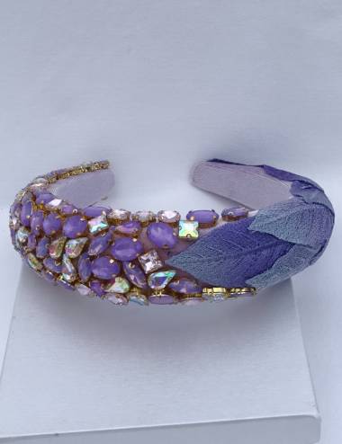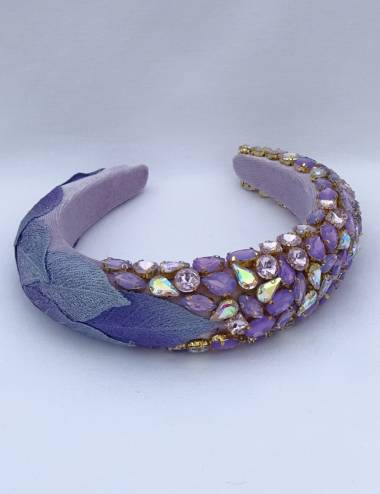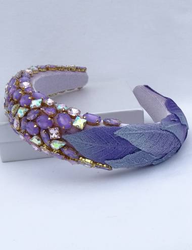 Diadema de fiesta en tonos malvas y violeta. Fabricada artesanalmente a mano con pedrería de gran calidad y hojas bordadas en tonos a juego.