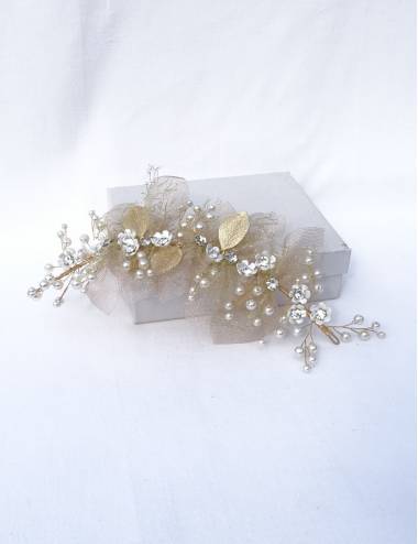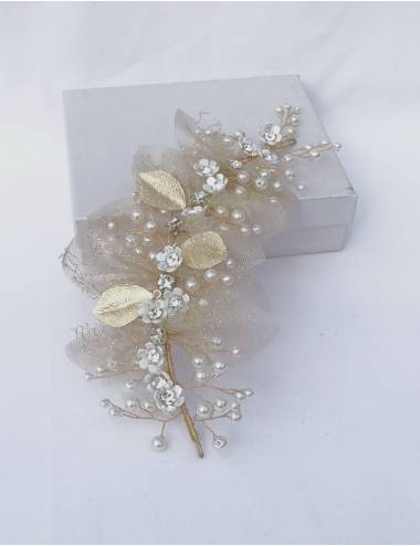 Bonito tocado de ceremonia, para novia o invitadas hecho de hojas metalicas y te tejido traslucido con un toque de brillo, en tonos dorados muy claro, y pequeñas floresy perlitas blanco roto. Tocado grande que admite multiples posiciones, o también se puede acoplar a una cinta para crear un cinto de fiesta,o para colocar sobre el vestido de novia.
