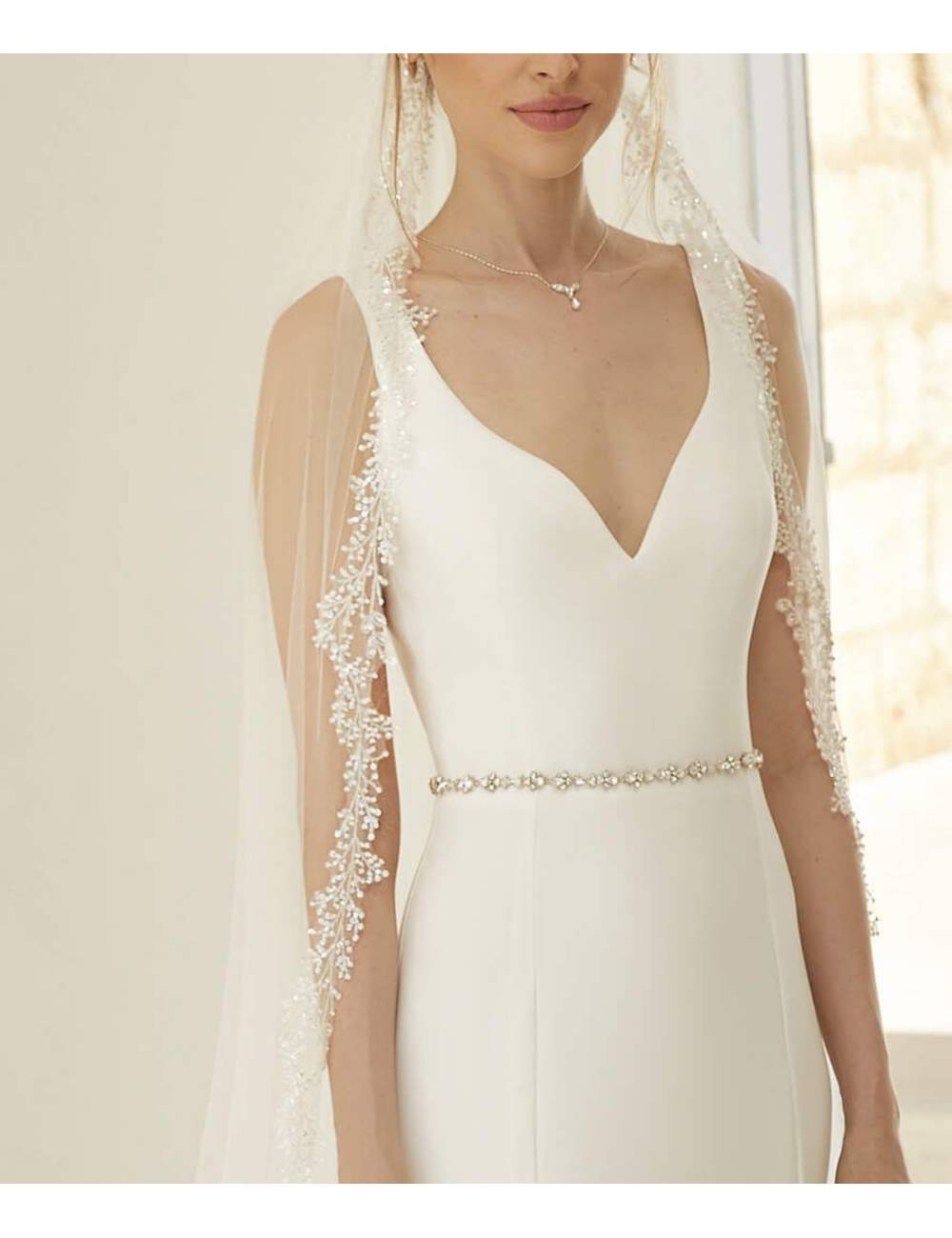 Precioso velo de novia, con encaje, elaborado en tul sedoso con borde de encaje simulando pequeñas ramas y brotes. Un velo de novia muy versátil y elegante para combinar con múltiples estilos de vestido de novia. Largo 3 metros