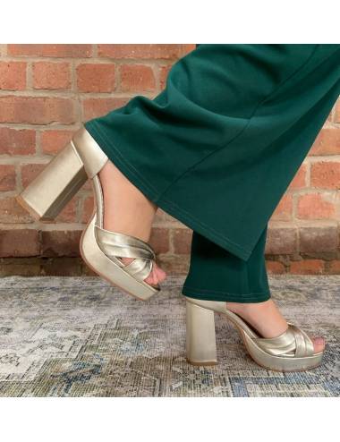 Sandalias de Fiesta de ultima tendencia en piel color dorado claro. Tacones muy gruesos cuadrados para una mayor estabilidad. Compensados con plataforma de 2,5cm. Los zapatos de invitada que necesitas para deslumbrar